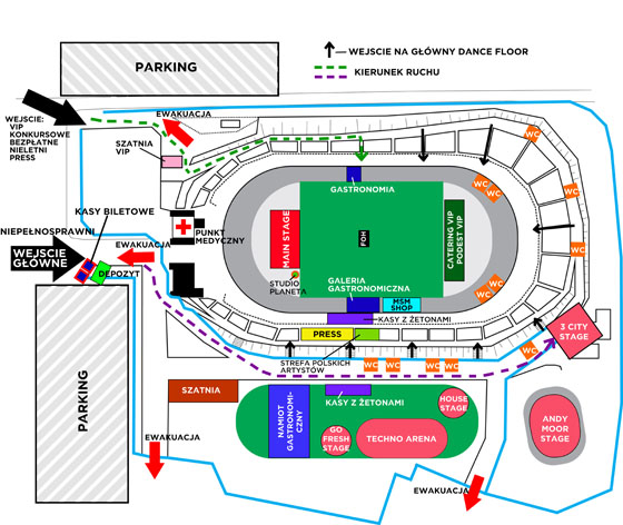 Dojazd na festiwal Od strony Centrum do stadionu istnieje możliwość dojazdu liniami autobusowymi 111, 112, 178 i 186 oraz liniami tramwajowymi 3, 8 i 68. Należy wysiąść na przystanku "Brama Żuławska" (linie 3, 8, 68, 112, 178, 186) lub na przystanku "Elbląska" (linia 111). Warto wiedzieć, że w ramach zasileń sezonowych, prawie do godz. 19:30 linia 3 kursuje co około 10 minut, natomiast z Chełmu zapewni dojazd nowa linia sezonowa 68. Dojazd od Dworca PKP Autobusem - linie 106 (w kierunku Westerplatte), 111 (w kier. Górek Wschodnich), 112 (w kier. Przegaliny), 120 (w kier. Sztutowskiej), 138 (w kier. Nabrzeża Przemysłowego), 178 (w kier. Olszynki) - 5 przystanków. Pieszo - 30 minut drogi - ulicami Elżbietańską i Garncarską, przez Targ Drzewny do Targu Węglowego, następnie przez ul. Długą, Długi Targ, Stągiewną oraz Długie Ogrody do końca.