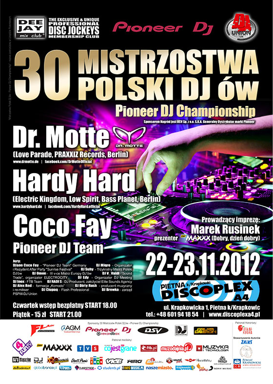 Wydarzenia towarzyszące XXX Mistrzostw Polski DJ`ów Pioneer DJ Championship 2012 22.11. Wystawa sprzętu różnych marek dla DJ-i i Producentów zorganizowana przez DJ-Sklep.com. 23.11. godz. 17:00 Otwarte spotkanie z przedstawicielami PSPM DJ Union, Dee Jay Mix Club, Fundacją Legalna Kultura, Stowarzyszeniem Autorów ZAiKS oraz Związkami Zawodowymi Twórców Kultury (w ramach którego została powołana sekcja Prezenterów i DJ-ów) podczas, którego planowana jest dyskusja na tematy dotyczące prawa autorskiego oraz legalnej pracy DJ-a. 23.11. godz. 18:00 Specjalny pokaz sprzętu marki Pioneer, mobilnych kolumn BOSE L1s oraz skrzyń transportowych (cases) 12 P.M oraz elementów wystroju wnętrz Grupy Design przygotowany przez Flash Professional z Krakowa oraz portal FTB.pl. Dla uczestników zostaną rozlosowane nagrody w postaci słuchawek BOSE, głośniczków do komputera BOSE, Bonów na zakup Case o wartości 150zł, 300zł i 500 zł oraz torby UDG i innych gadżetów.