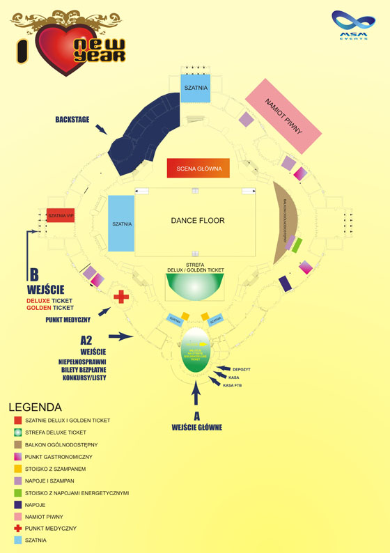 MSM GOLDEN TICKET upoważnia do wstępu do strefy usytuowanej na balkonie z widokiem na scenę główną z zagwarantowanym miejscem siedzącym. Posiadacz MSM GOLDEN TICKET ma zagwarantowane: - osobne wejście na teren imprezy - osobną bezpłatną szatnię - bezpłatne zimne napoje (ilość ograniczona) - bezpłatne zimne napoje energetyczne (ilość ograniczona) - bezpłatne piwo LECH (ilość ograniczona) - bezpłatne przekąski - bezpłatną lampkę sylwestrowego napój z bąbelkami - możliwość zakupu napoi alkoholowych w specjalnie wydzielonym barze.