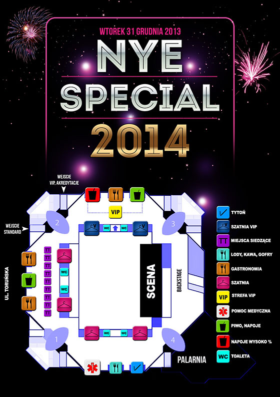 BILETY Zgodnie z uzyskanymi pozwoleniami, 3000 klubowiczów będzie mogło wziąć udział w New Years Eve Special 2014 w bydgoskiej Hali Łuczniczka. W związku z tym chcemy udostępnić Wam jak najwięcej biletów w drugiej puli sprzedaży, a także poinformować dokładnie, ile w chwili obecnej pozostało jeszcze promocyjnych pakietów, dzięki którym możecie dodatkowo zaoszczędzić wybierając się na NYE Special 2014. O dostępności biletów będziemy informowali Was na bieżąco za pomocą naszego fanpage. Bilety w dniu imprezy będą dostępne w bardzo ograniczonej ilości, dlatego polecamy nabyć je z wyprzedzeniem.