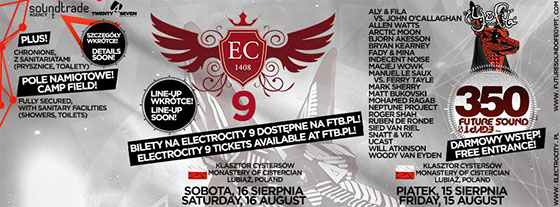 Jak zapowiadaliśmy wcześniej, właśnie w tym momencie rusza sprzedaż I puli biletów na tegoroczną edycję Electrocity, która odbędzie się 16 sierpnia 2014. Możecie je nabywać za pośrednictwem bileterii Ftb.pl w cenie 89 zł. Przypominamy, że ilość biletów I puli jest limitowana ilościowo i czasowo, zatem nie czekajcie do ostatniej chwili i dołączcie do grona tych, którzy w sierpniu pojawią się w pocysterskim opactwie w Lubiążu! Line-up Electrocity 9 zaczniemy publikować wkrótce.