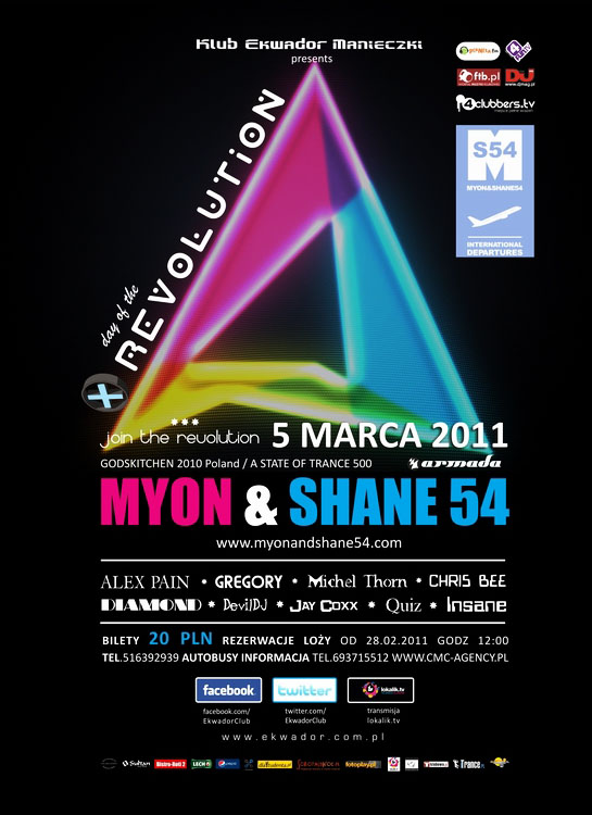 Nadchodzi dzień rewolucji !!! Początek roku dla Ekwadoru okazał się tektonicznym wydarzeniem, które wstrząsnęło wszystkimi muzycznymi sektorami polskiej sceny klubowej: Andy Moor, Richard Durand, Ummet Ozcan,Mike Shiver,Ben Nicky sprawili, że od ich bitów zabawa sięgała sufitu Ekwadoru! Teraz przyszła kolej na noc, która na zawsze przejdzie do historii muzyki klubowej w Polsce jako muzyczne objawienie trance & progressive, które sprawi,  że weźmiecie udział w międzyplanetarnym odlocie z najlepszymi pilotami jakimi poszczycić się może globalna scena muzyczna: MYON & SHANE54 – gwiazdy ASOT 500 tylko w Ekwadorze!