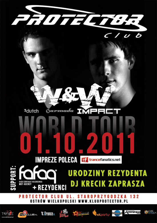Klub Protector w Ostrowie Wielkopolskim, zaprasza na „Impact Album Tour“ z udziałem duetu W&W w sobotę 1 października 2011. Ponadto na imprezie support zagra Fafaq, a dodatkowo rezydent – Marcin „Krecik“ Walczak zaprasza na swoje urodziny. Protector sprawił mu prezent w postaci grubej potańcówki. Teraz wasza kolej na prezent dla osoby, która od wielu lat dowodzi konsoletą na Staroprzygodzkiej 132 w Ostrowie Wielkopolskim.