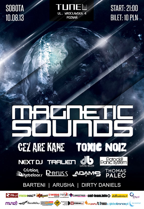 Po czteromiesięcznej przerwie Magnetic Sounds powraca z dziewiątą odsłoną. Cykl skierowany jest dla osób ceniących sobie unikalny klimat muzyczny, będący kombinacją klubowej i eventowej atmosfery. Na imprezie posłuchać będzie można wyszukanych brzmień w klimatach techno, trance czy house. Dziewiąta edycja imprezy odbędzie się w poznańskim klubie Tunel, gdzie wystąpią dla Was Cez Are Kane oraz Toxic Noiz a supportować ich będzie aż 11stu DJów.